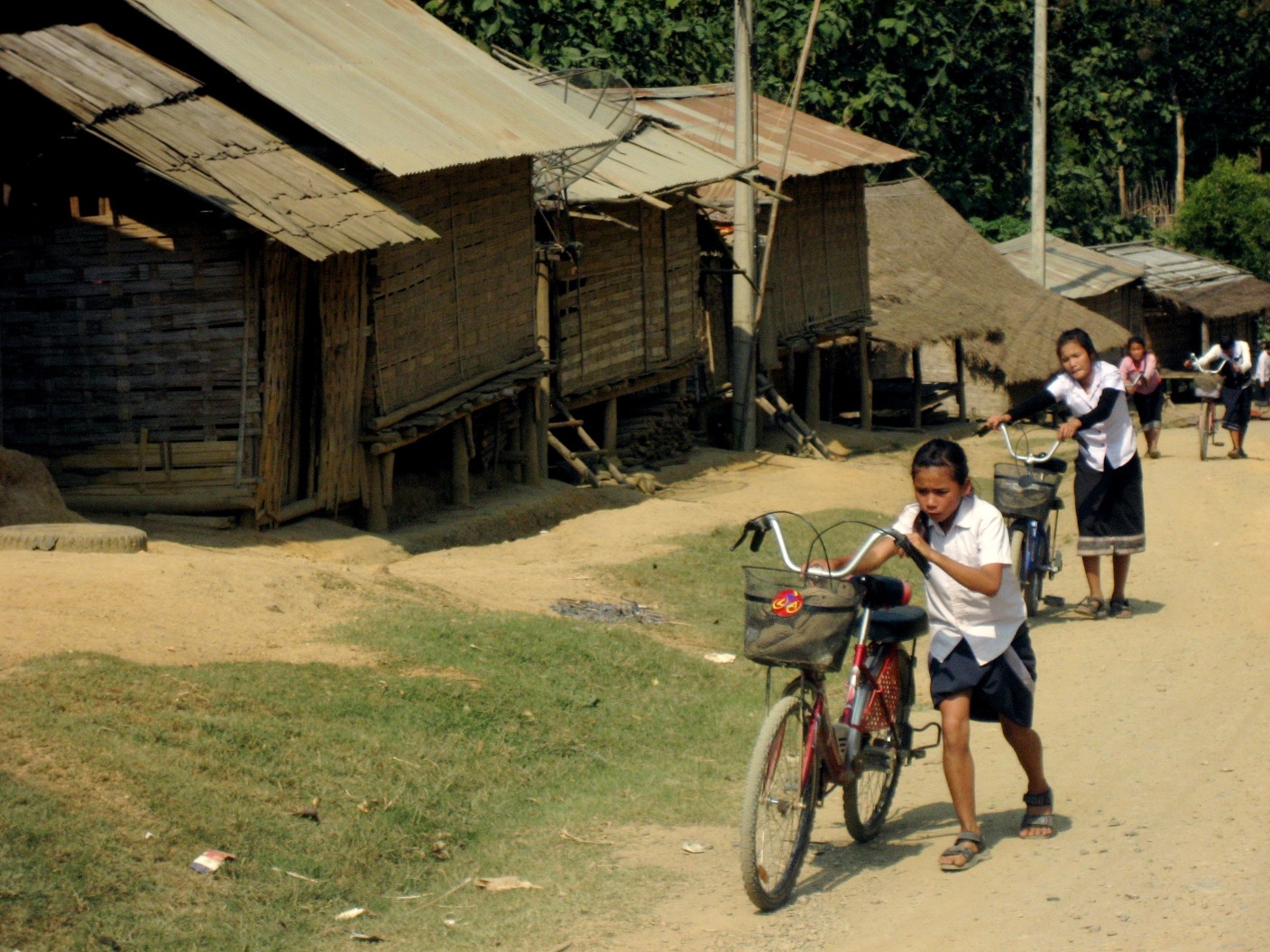 There are every few schools in the area so many children have to pass through other villages to get to school and some travel as much as 90 minutes each way. These girls are fortunate to have bicycles by many can only afford to travel on foot.
